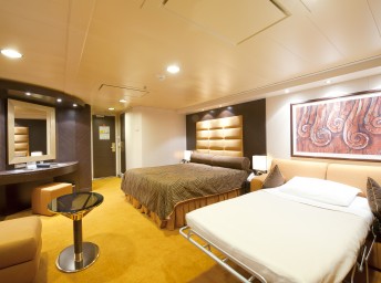 Suite s balkónom/panoramatickým oknom: 21-47m², (Royal 53m², Family 52m²)kajuta s manželskou posteľou (na požiadanie 2 oddelené postele) a rozkladacia pohovka. Klimatizácia, kúpeľňa s vaňou, toaletný stolík, priestorná skriňa, interaktívna TV, telefón, minibar, sejf, sušič na vlasy. Balkón so stolíkom a stoličkami/panoramatické okno. Internetové pripojenie (za poplatok).