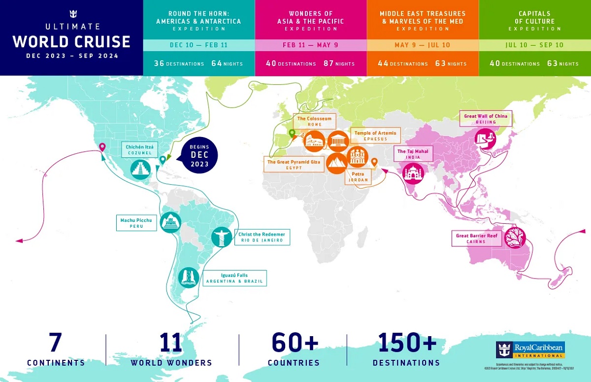 Lodná spoločnosť Royal Caribbean zdvíha laťku tradičných plavieb okolo sveta inauguráciou svojej Ultimate World Cruise, epického 275-dňového dobrodružstva, ktorého účastníci navštívia všetkých 7 svetových kontinentov, viac než 150 rôznych destinácií v 65 krajinách a 11 divov sveta.