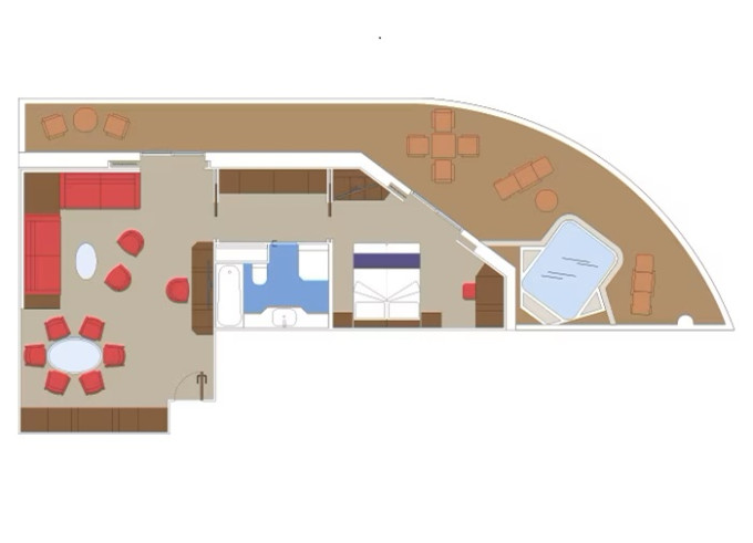 YC3 - Yacht Club Royal Suite s vírivou vaňou 51-59 m² / balkón s vírivkou 42-51 m². Oddelená obývačka a spálňa, šatník, kúpeľňa s vaňou. Max 4 osoby. 16/18. paluba. Cenový model MSC Yacht Club. | 11 042 € 5 521 € za osobu |