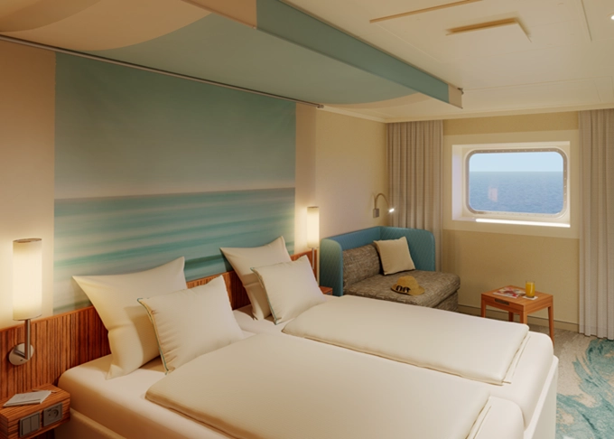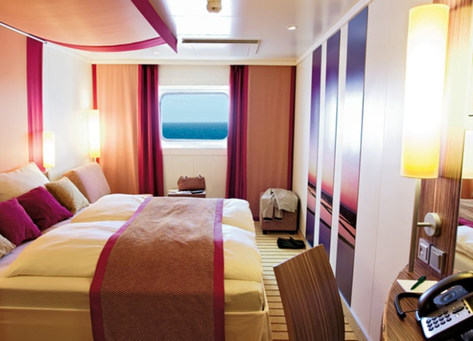 CA - Vonkajšia kajuta PREMIUM / obmedzený výhľad 14-16,5 m². Neotvárateľné okno / obmedzený výhľad. 6. paluba. Max 2 osoby. Cenový model Premium. 2 370 € 1 185 € za osobu