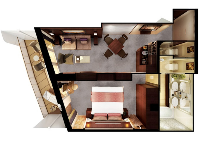 M1 - Club Suite Aft-facing 47 m² / balkón 19 m². 10. paluba - vzadu. Max 2 osoby. Výhody Club. | 3 674 € 1 837 € za osobu |