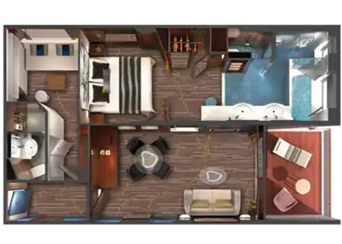 M1 - Club Suite Aft-facing od 25 m² / balkón 5-7 m². 11. paluba - vzadu. Max 4 osoby. Výhody Club. | 2 794 € 1 397 € za osobu | ||
