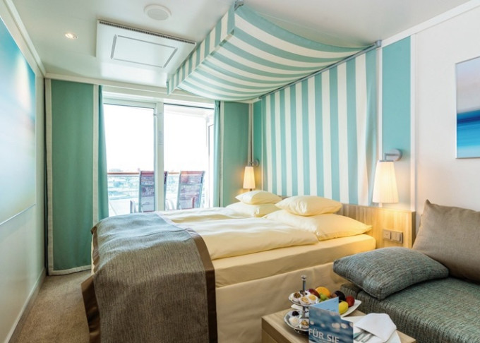 VB - Kajuta s verandou Komfort PREMIUM od 20 m² + balkón od 6 m². Šatník. 5,8,9. až 15. paluba. Max 3 osoby. Cenový model Premium. | 2 820 € 1 410 € za osobu |