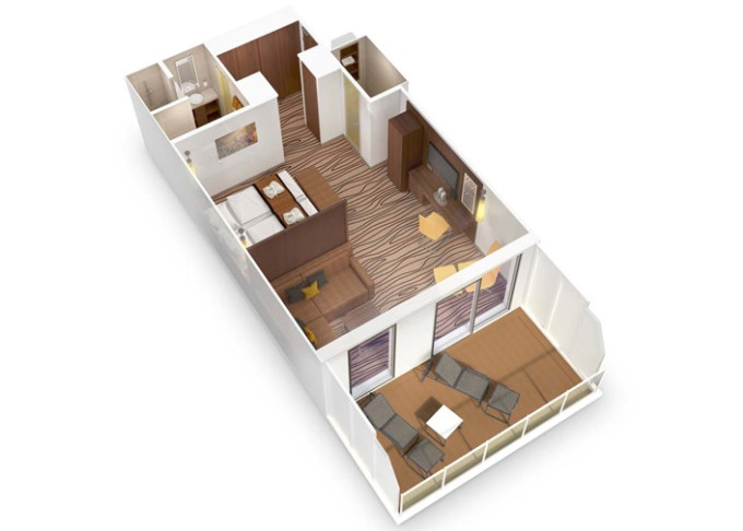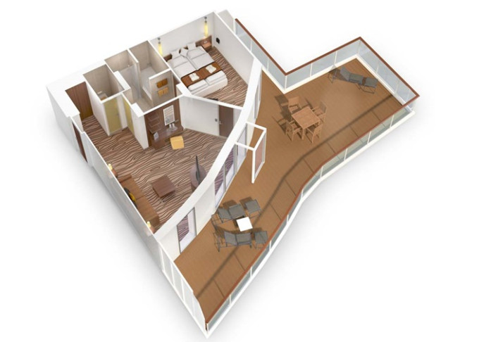 SA - Suite Deluxe PREMIUM 43 m² / 72 m² balkón. 12. paluba. Max 4 osoby. Cenový model Premium + výhody Suite. | 6 410 € 3 205 € za osobu |